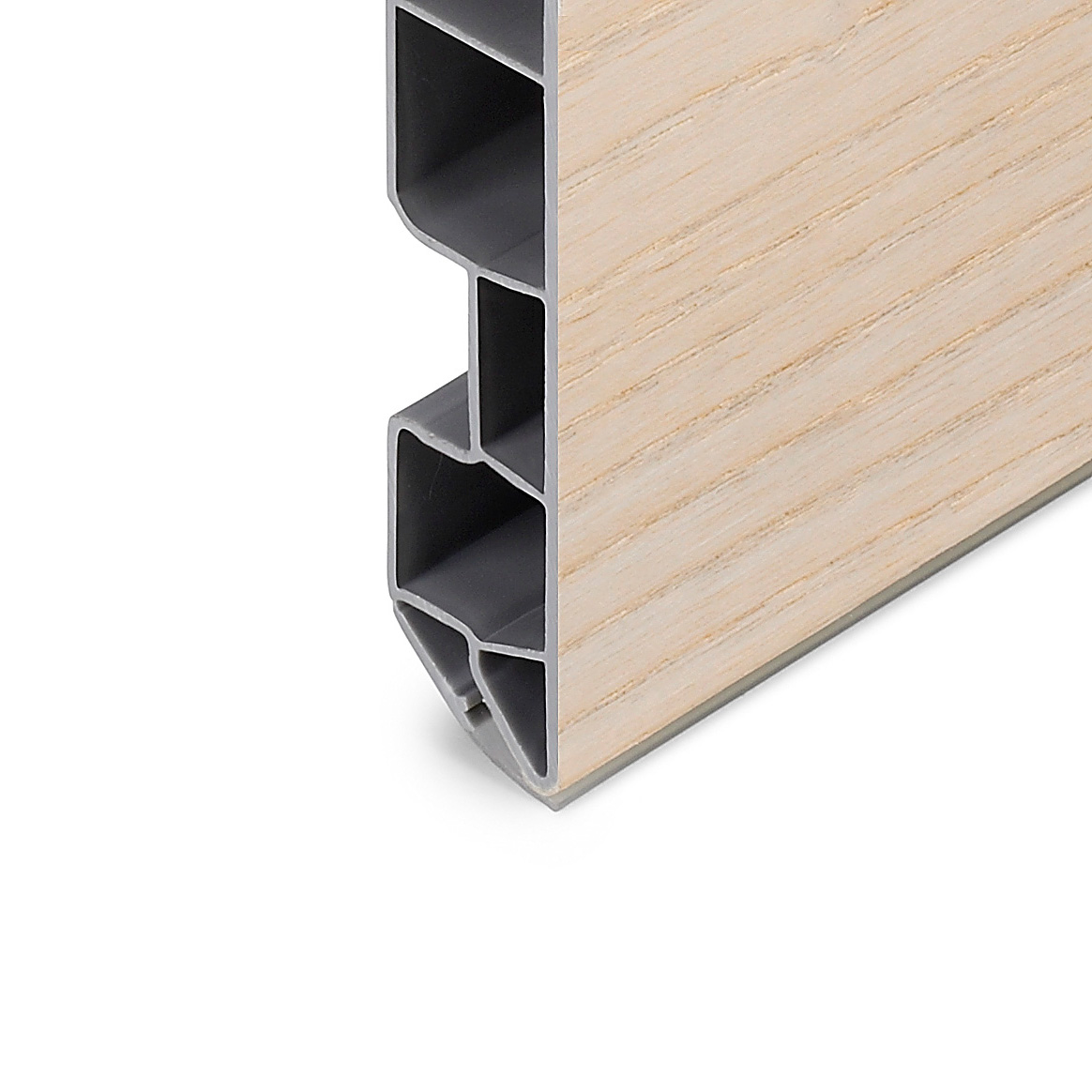 Raw veneer Artificial resin plinth with semi-concealed opaline gasket. The veneered plinth is only supplied with raw wood finishes. Accessories are supplied in lengths.