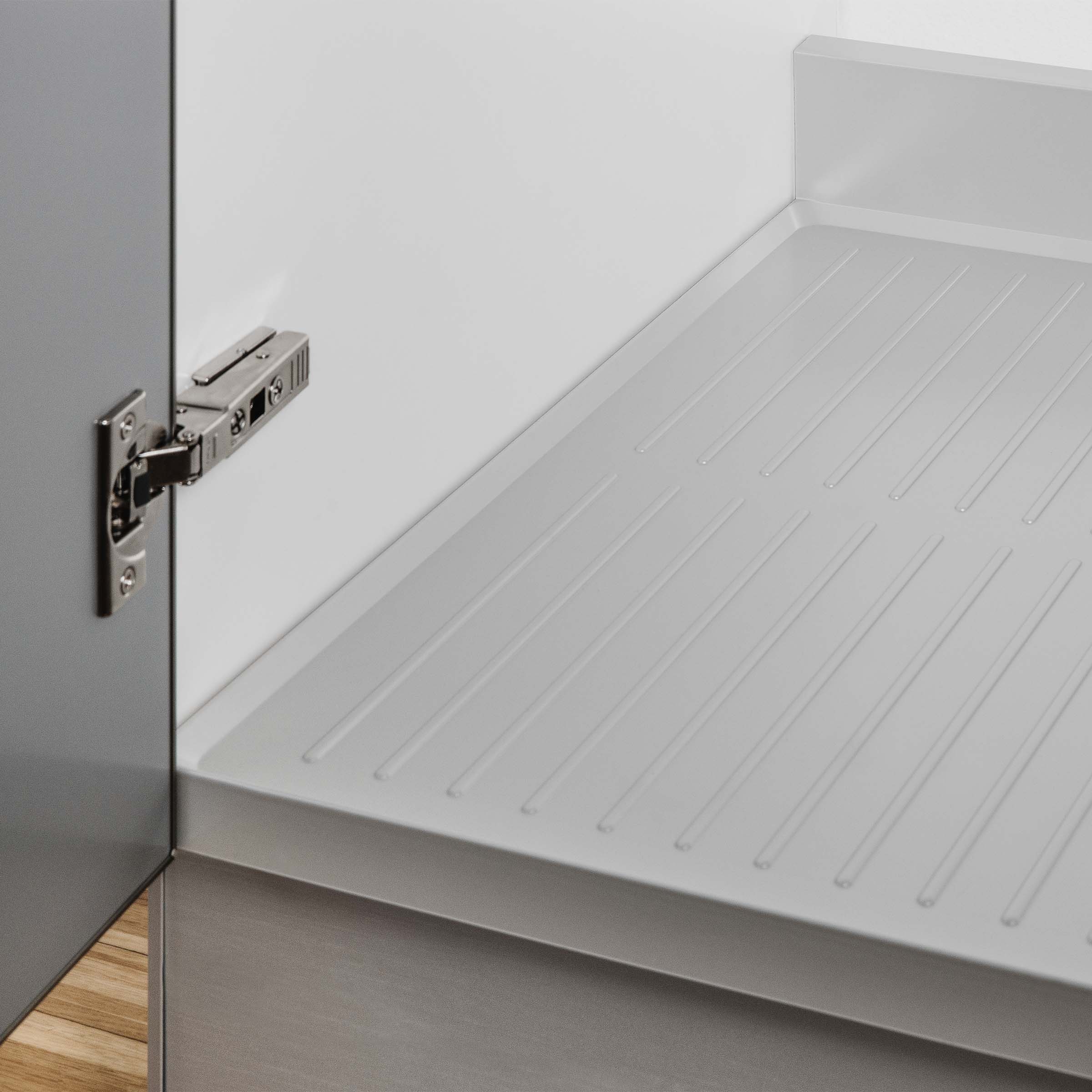 Cabinet side panels, 18 mm thick. Thermoplastic tray protector. Rear backsplash.