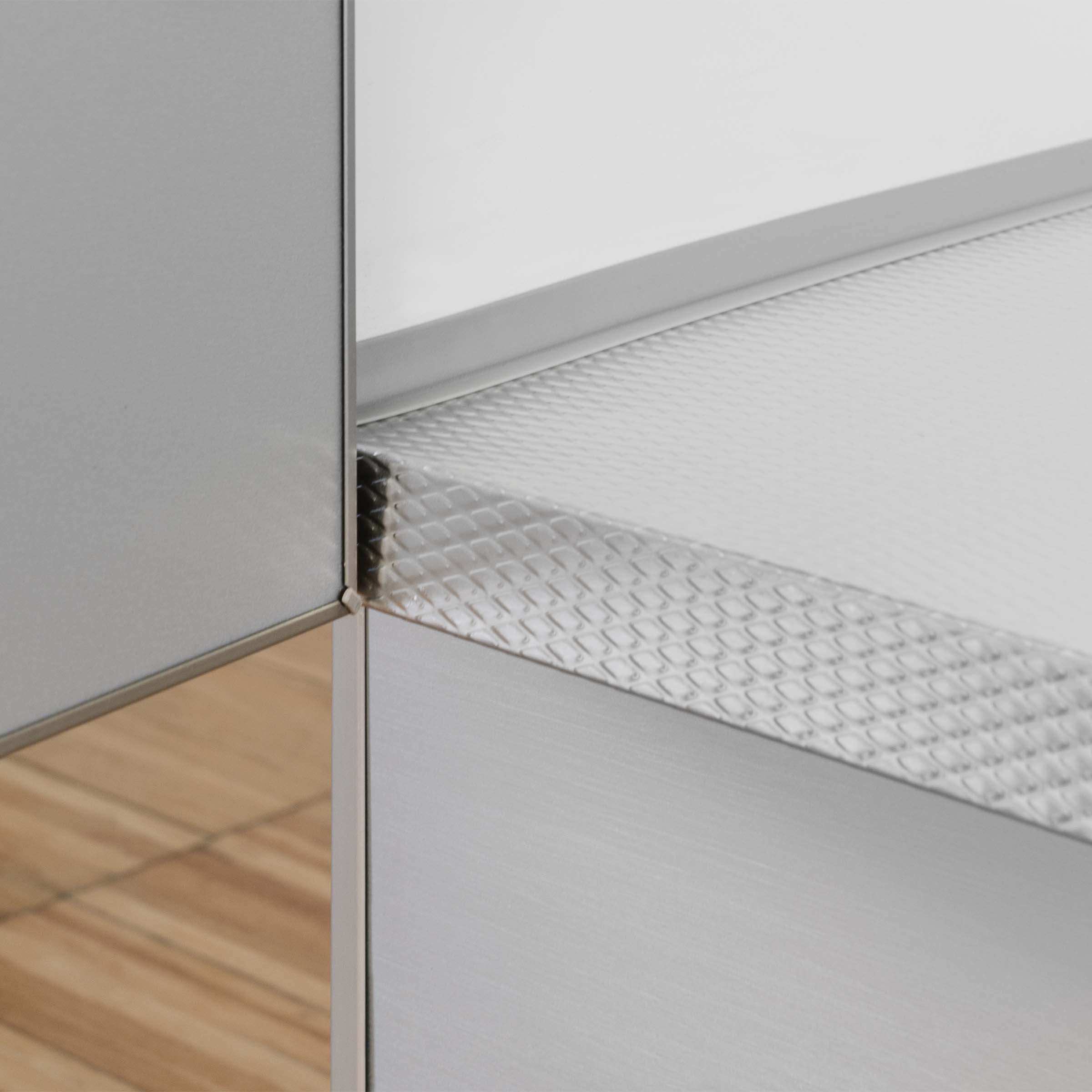 Fianchi mobile spessore 18 mm. Protezione piatta in alluminio rombato. Guarnizioni laterali e alzata posteriore.