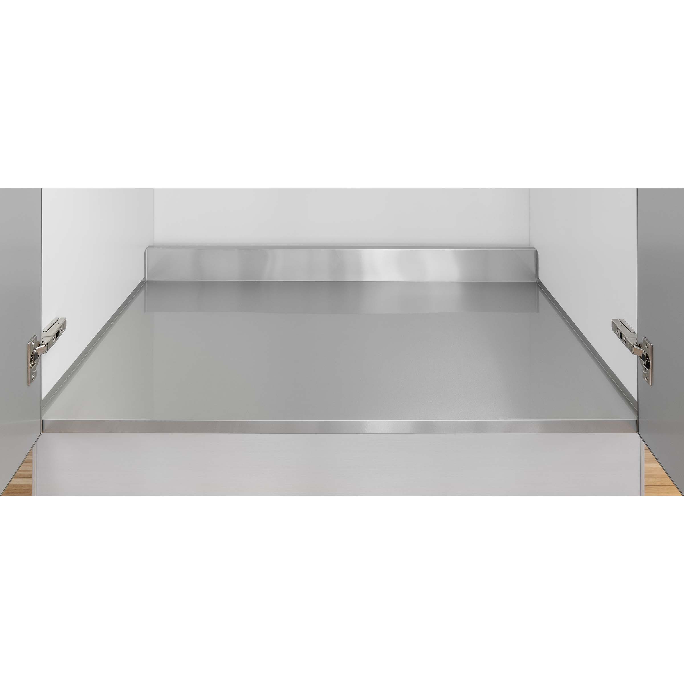 Fianchi mobile spessore 18 mm. Protezione piatta in alluminio liscio, verniciato lucido. Alzata posteriore e laterali piegati.