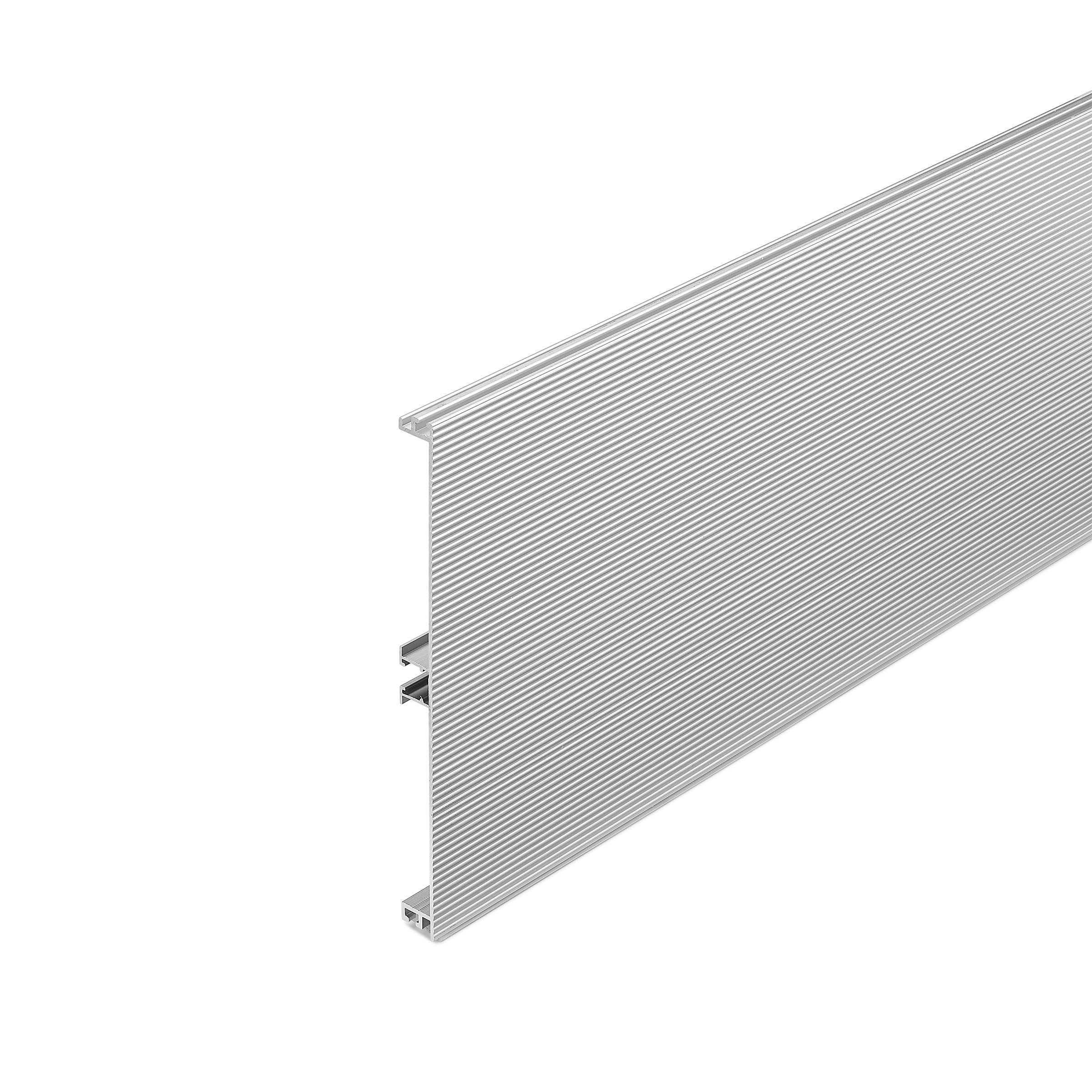 Zoccolo in alluminio millerighe con guarnizione opalina a semiscomparsa. Completo di film protettivo.